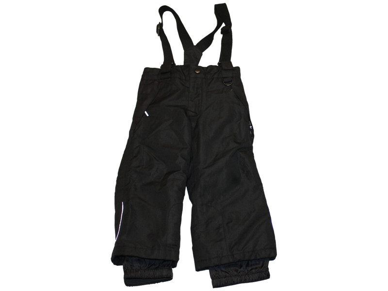 Dereka hátul gumis. Elöl patentos, cipzáras. Lábszárai végében hóvédő betét. Vállpántja levehető, állítható.